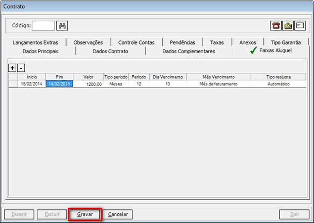 Ao finalizar o cadastro da faixa de aluguel, clique no botão Gravar.