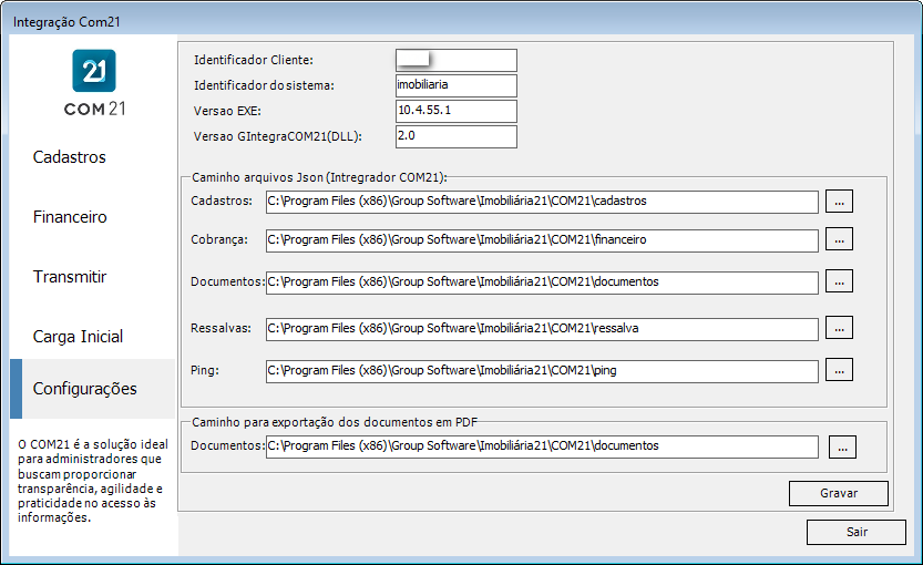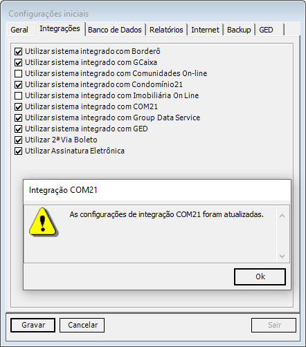 Ao salvar a alteração, o sistema exibirá uma mensagem informando que as configurações foram atualizadas e os dados na Integração COM21 no menu Integração > Group COM21 serão preenchidos.